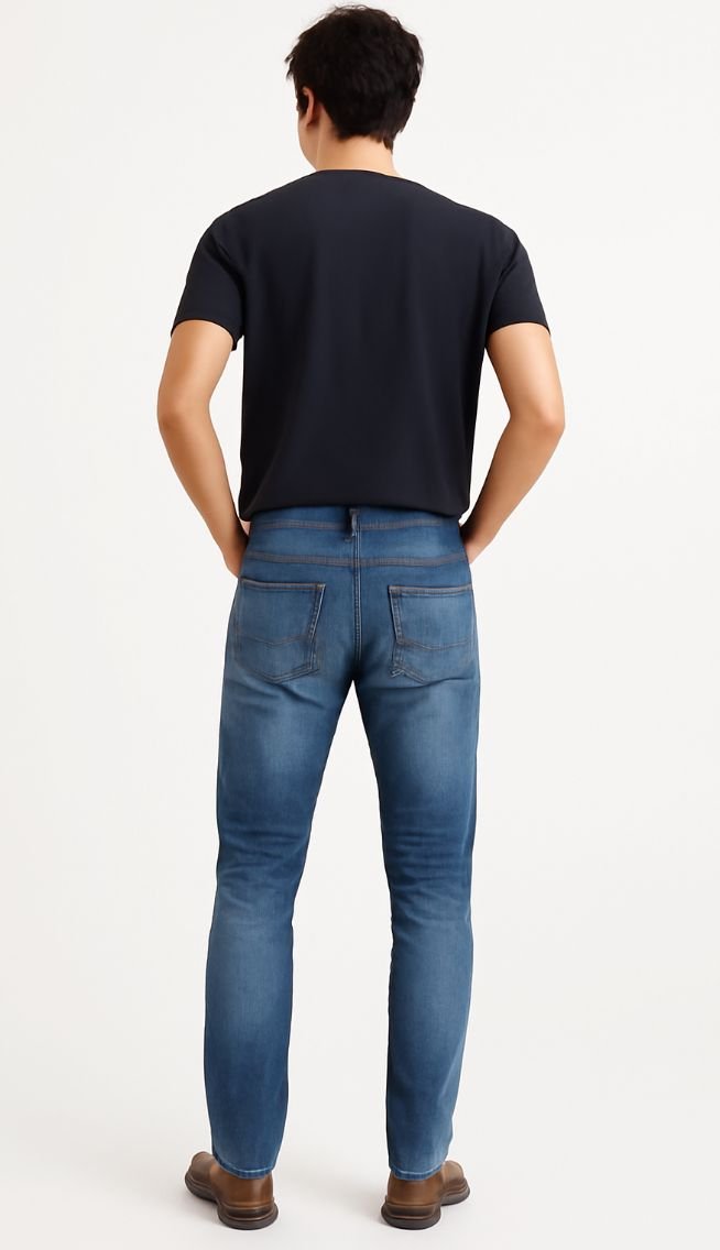 Upgrade your wardrobe with these timeless regular fit blue denim jeans. Designed for all-day comfort, these jeans are crafted from high-quality cotton denim that offers durability and a clean finish. The mid-blue wash adds a classic touch, making them perfect for both casual outings and semi-formal looks.
