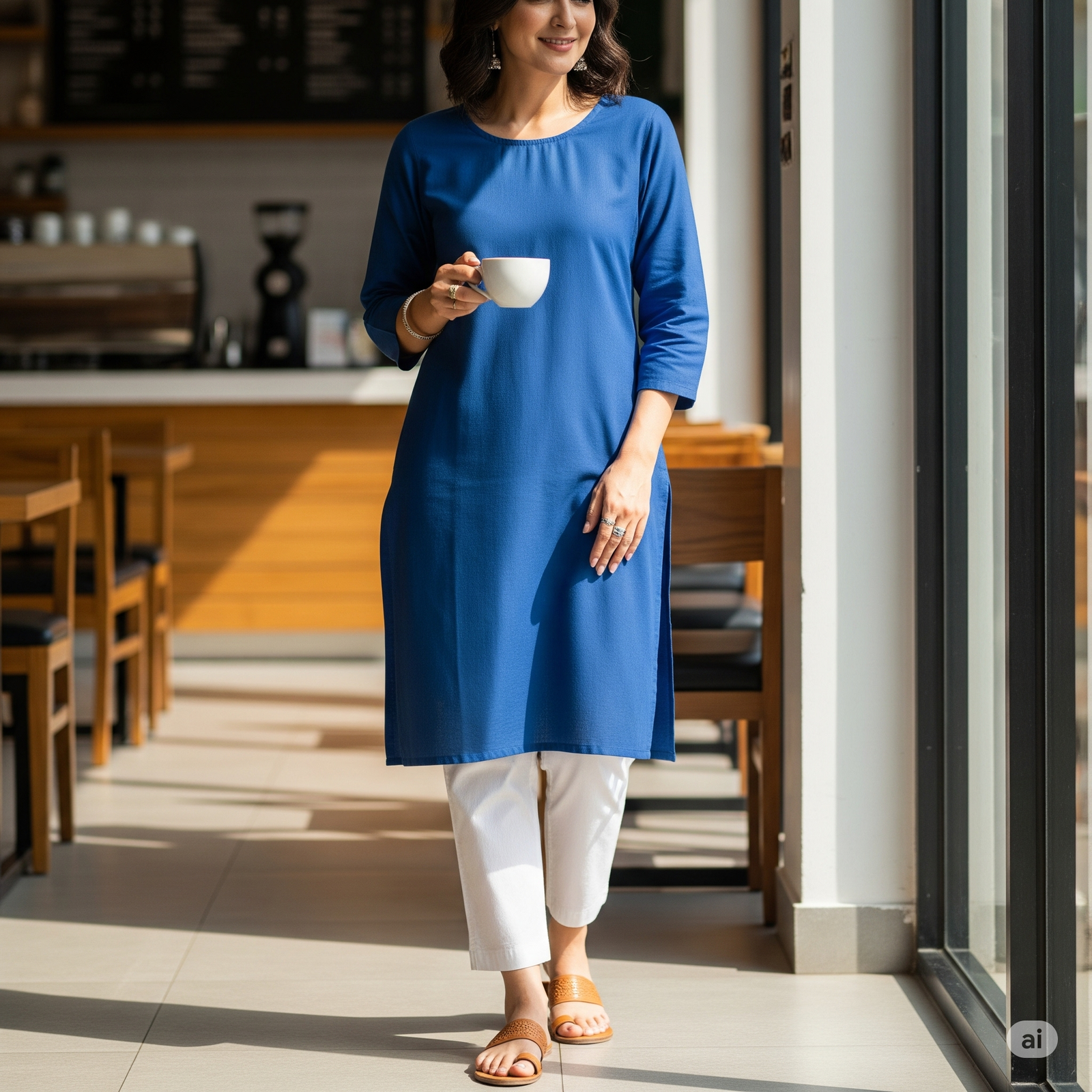 Elevate your everyday style with this Solid Blue Cotton Casual Kurti for women. Crafted from breathable cotton fabric, this kurti ensures all-day comfort while keeping your look chic and minimal. The round neckline and three-quarter sleeves add a touch of simplicity, while the straight fit with side slits offers ease of movement. Pair it with white leggings, palazzos, or jeans for a versatile look that transitions seamlessly from work to casual meet-ups. This kurti is a wardrobe essential for women who love timeless and comfortable fashion.